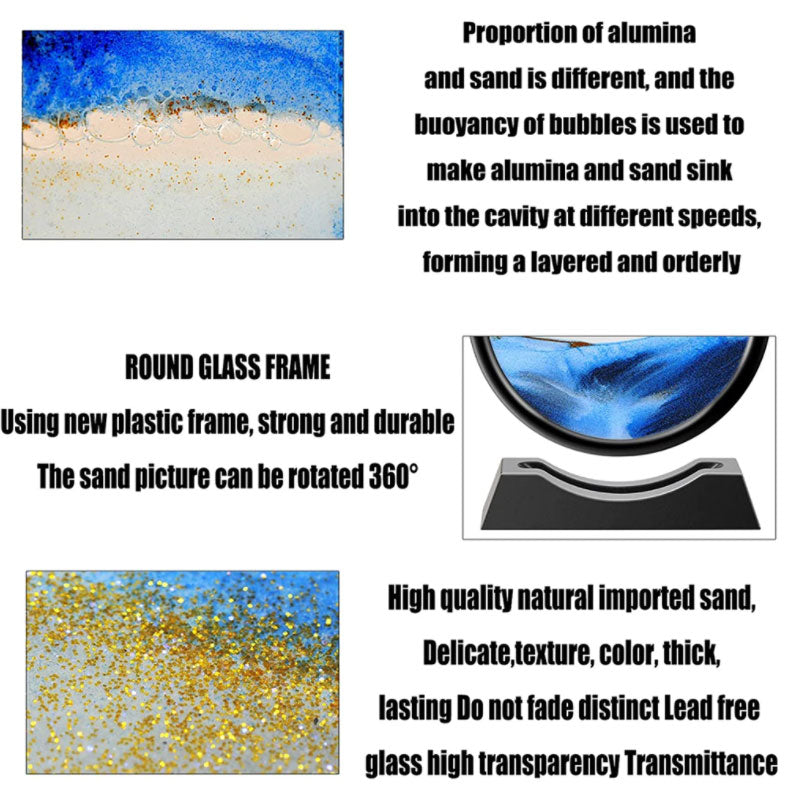 【Magnificent Dynamic Sandscape】- The dynamic sand picture can be rotated freely in 360, every time you turn it, the sand starts to move and slowly form deserts, oceans, mountains. You will be happy to enjoy the falling sand and the different landscape scenes, which will make you feel very relaxed and calm.