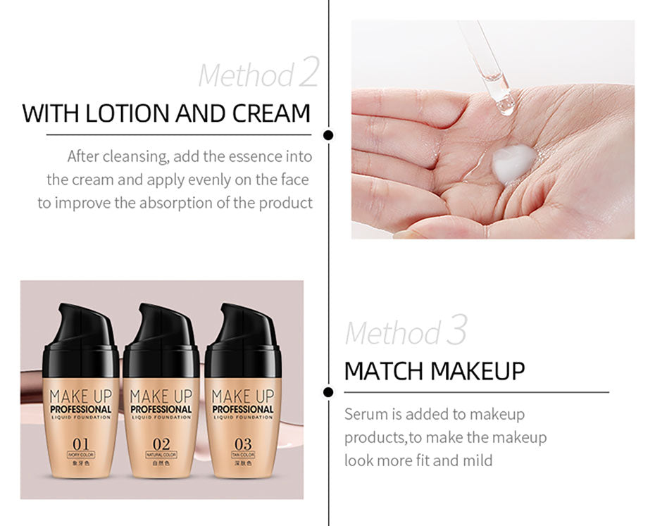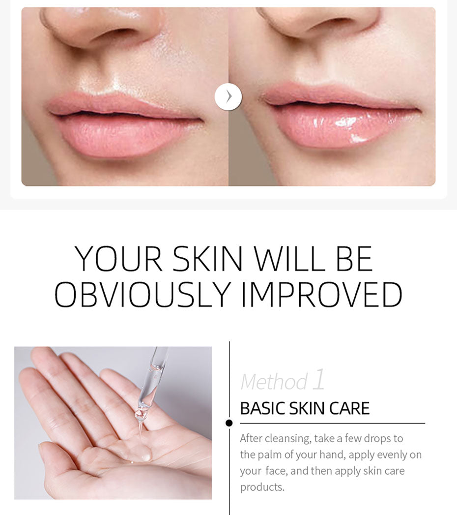 Efficacy: Hyaluronic acid serum has the best moisturizing ability, penetrtes into skin barriers, strenghtens skin base, and repair damaged skin. Deals with dry, dull aging and other skin problem to moisture and rejuvenate the skin.