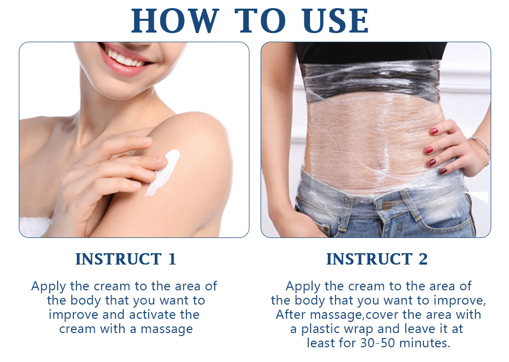 Apply the cream to the area of the body that you want to improve, After massage,cover the area with a plastic wrap and leave it at least for 30- 50 minutes.
