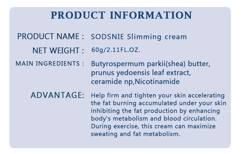 ADVANTAGE: Help firm and tighten your skin accelerating the fat burning accumulated under your skin inhibiting the fat production by enhancing body's metabolism and blood circulation. During exercise, this cream can maximize sweating and fat metabolism.