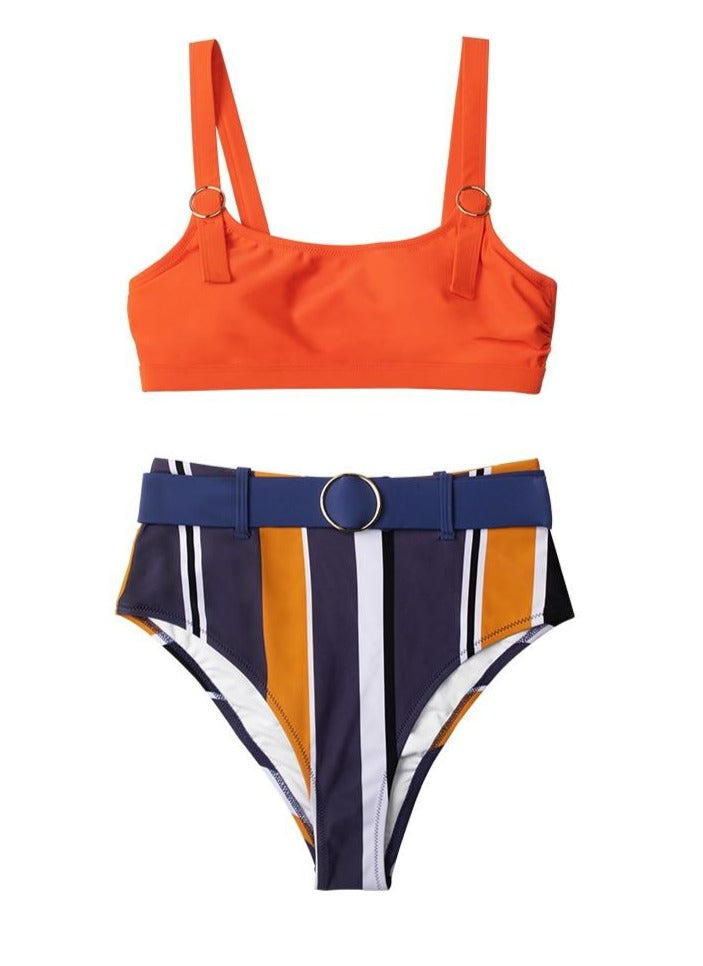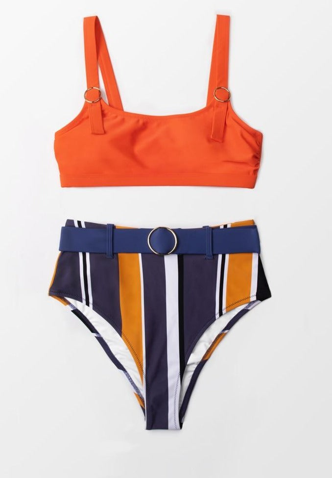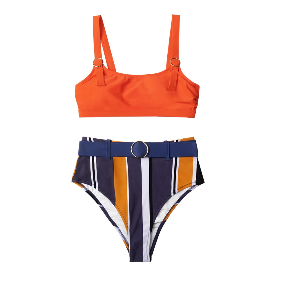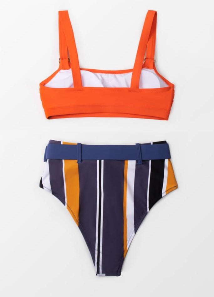 Designed to be seen everywhere, our Bright Summer Belted Striped Bikini set features a flattering silhouette that will make every one look amazing. Bikini top has a sporty tank top silhouette with o-ring adjusters at shoulder straps. Matching high waisted bottom has flattering tummy coverage with a belted design.