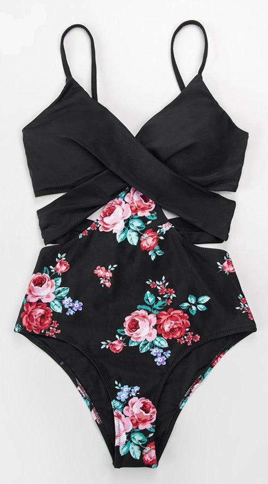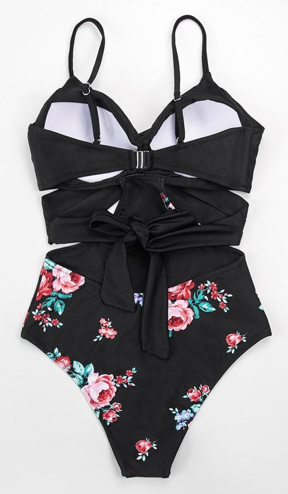 Create a beachside statement in our Black And Floral Wrap Cutout One-piece Swimsuit. Features a front wrap design that ties at the back with moderate cheeky coverage. Cutouts create an illusion of a high-waisted fit.