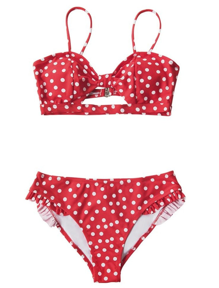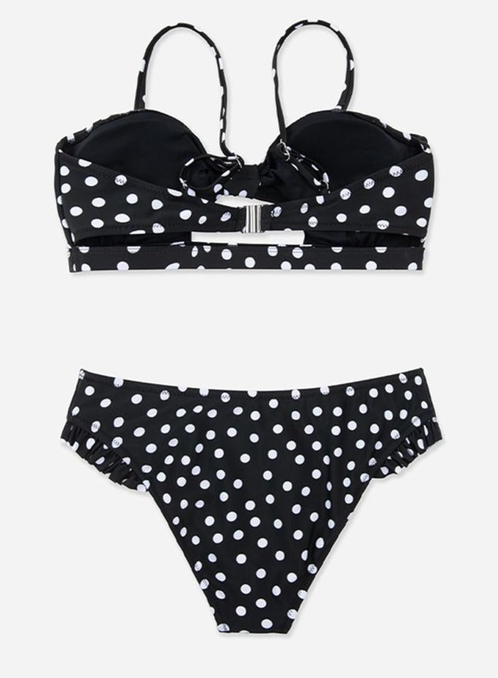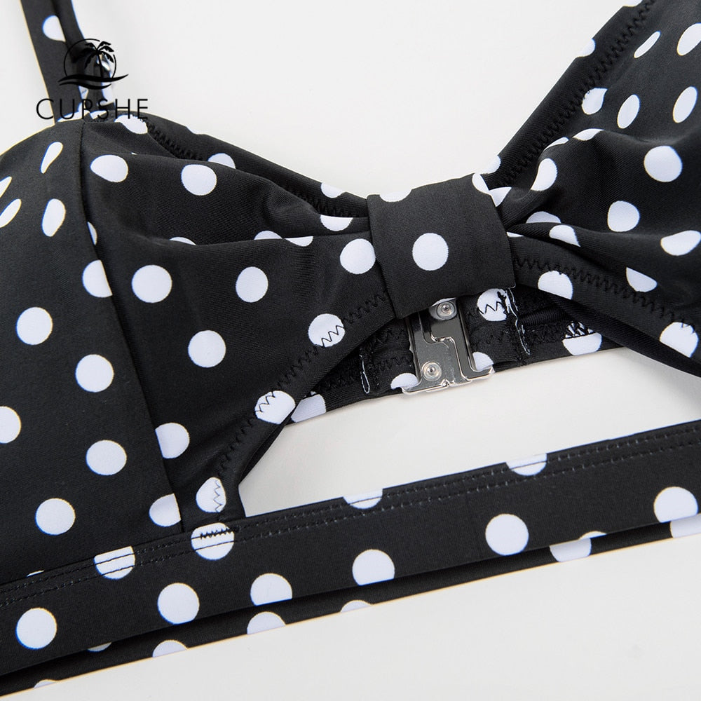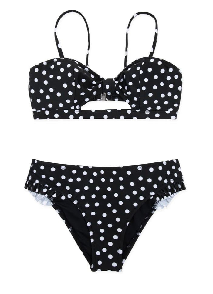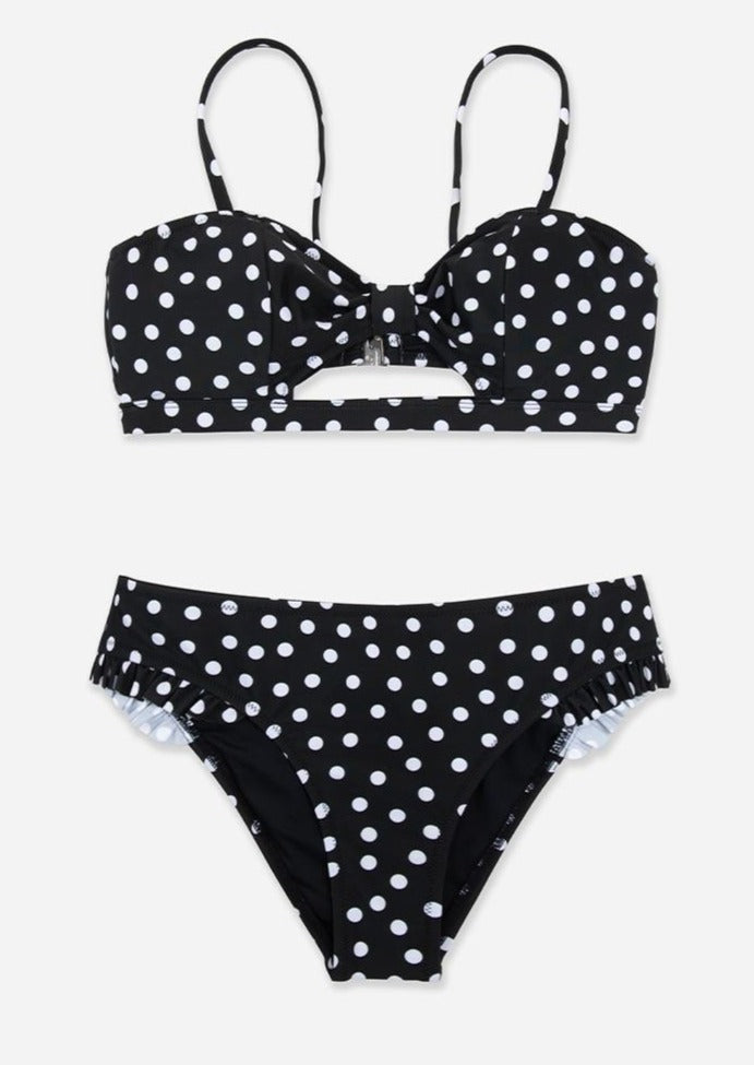 Regular price $37.95 USDDetailed with a flirty cutout under the bust and mini ruffles at the hips, this Black Polka Dot Cutout Bikini is the sweet and sassy two-piece you've been looking for. A back hook closure and adjustable shoulder straps ensure a secure fit.