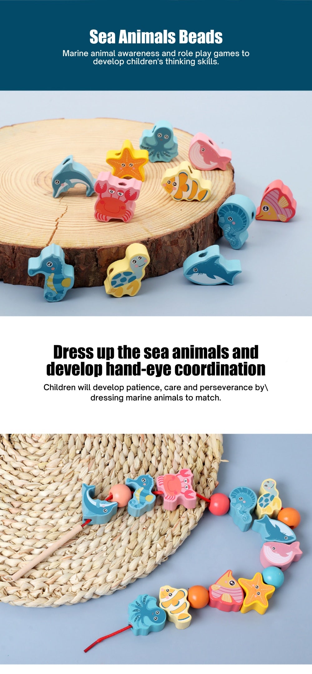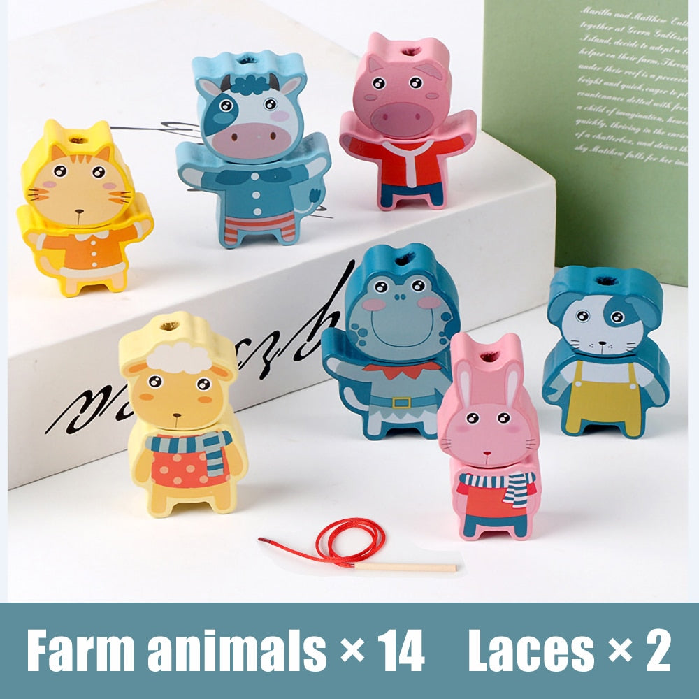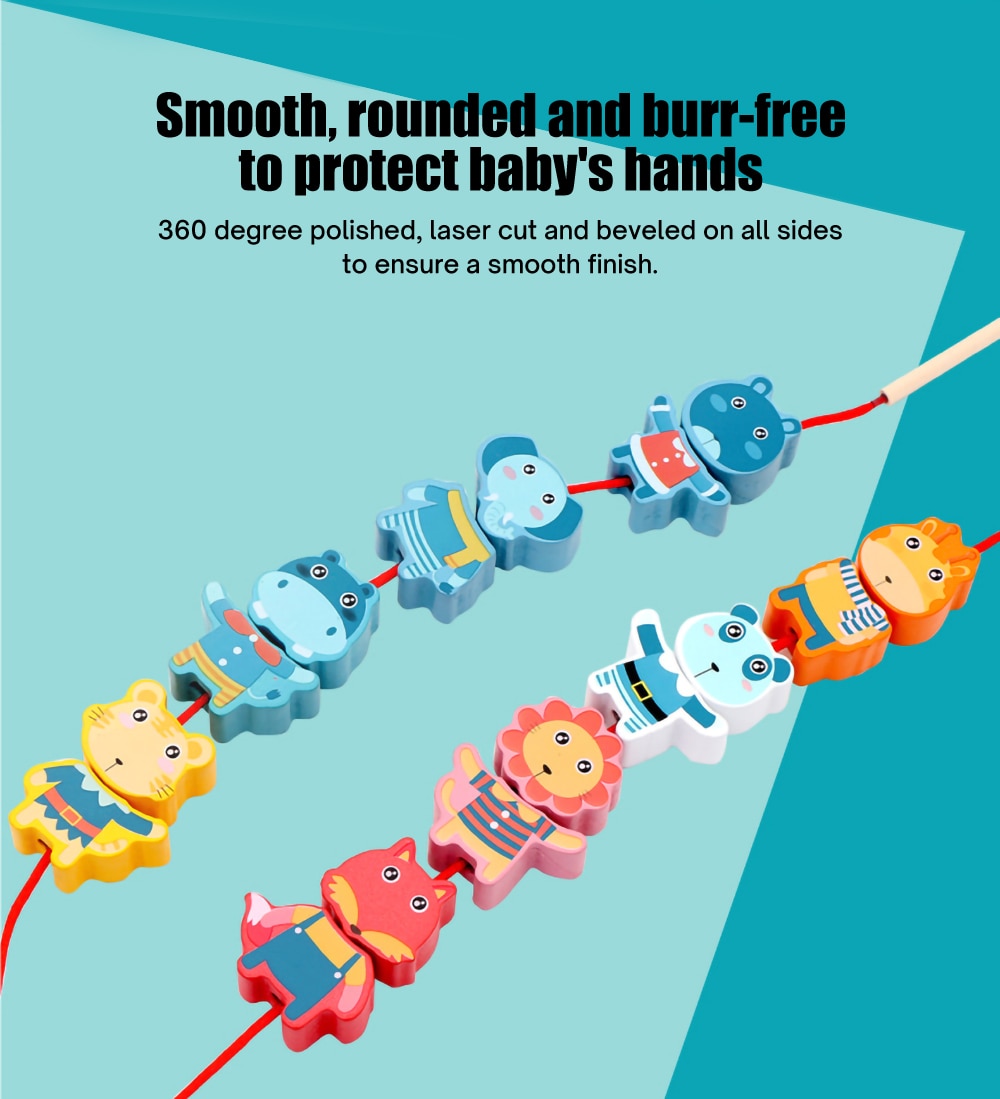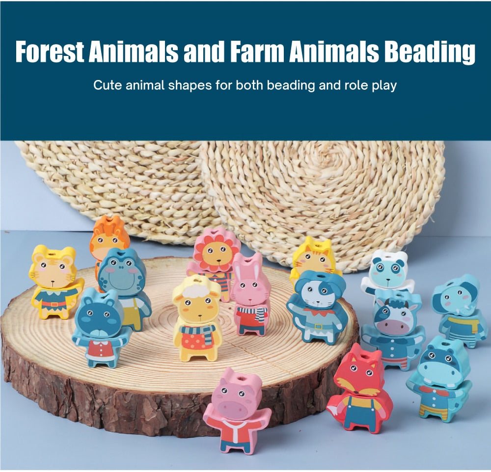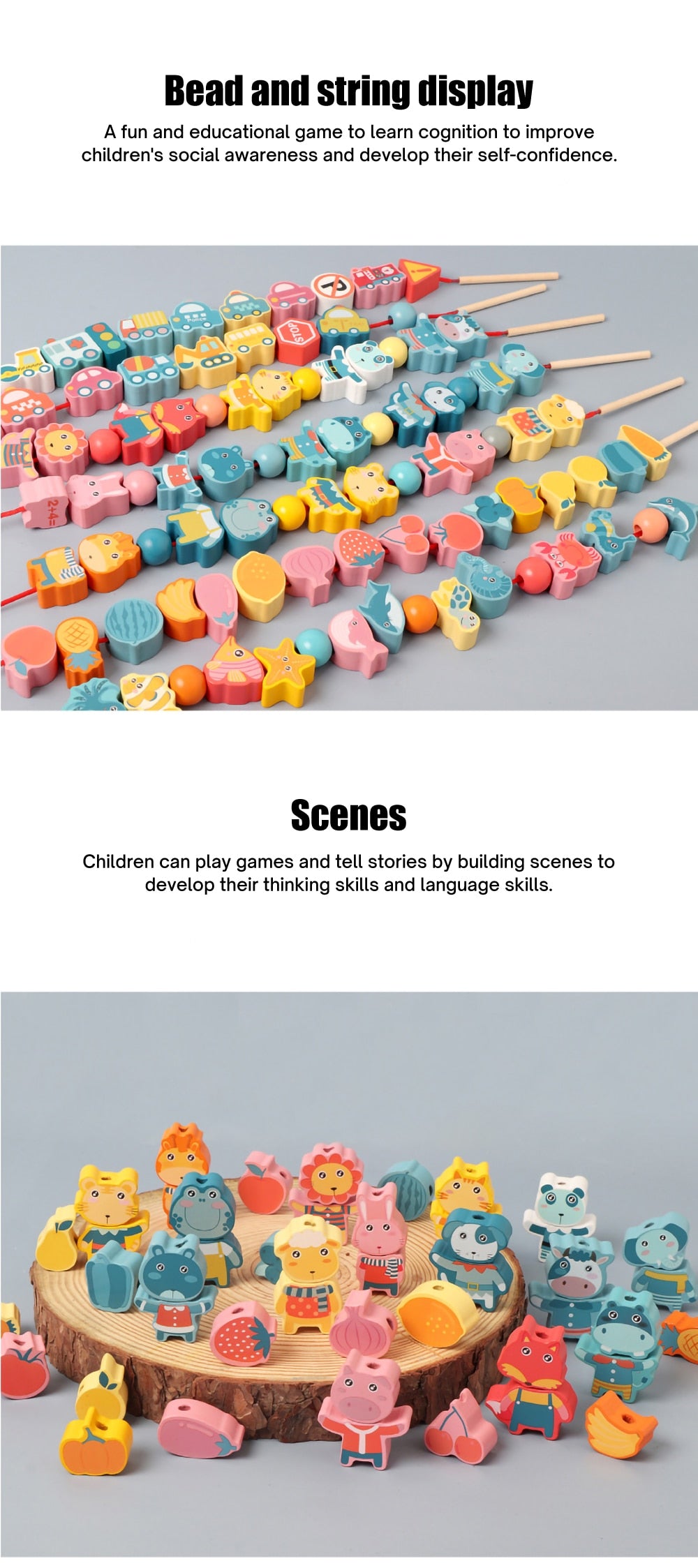 【Threading Toys for 2 3 Year Old】Wooden threading beads set include animals, fruits and vegetables. An interesting combination of wooden lace beads and stringing activity games, all wooden blocks shape have a smooth surface and light weight, suitable for children's small hands to grasp. The laces have a small wooden stick, which is a simple, safe and fun threading wooden toys for kids.