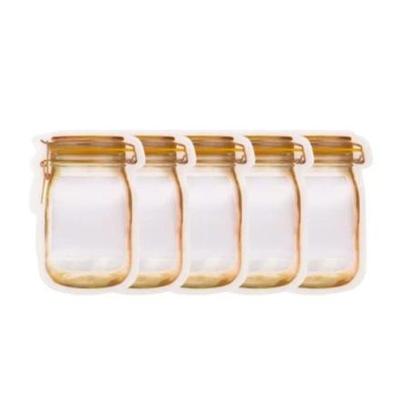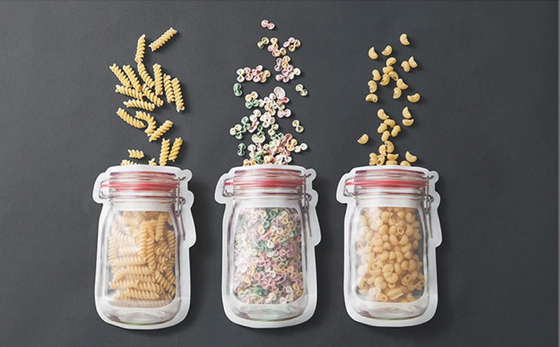 Keep your food fresh and delicious by using our reusable mason jar shaped zipper bags. It's unique design will wow you. Transparent mason jar shaped bags can be used for biscuits snack preservation, moisture and dust, to extend the food shelf life, is your kitchen helper. Great for home & travel